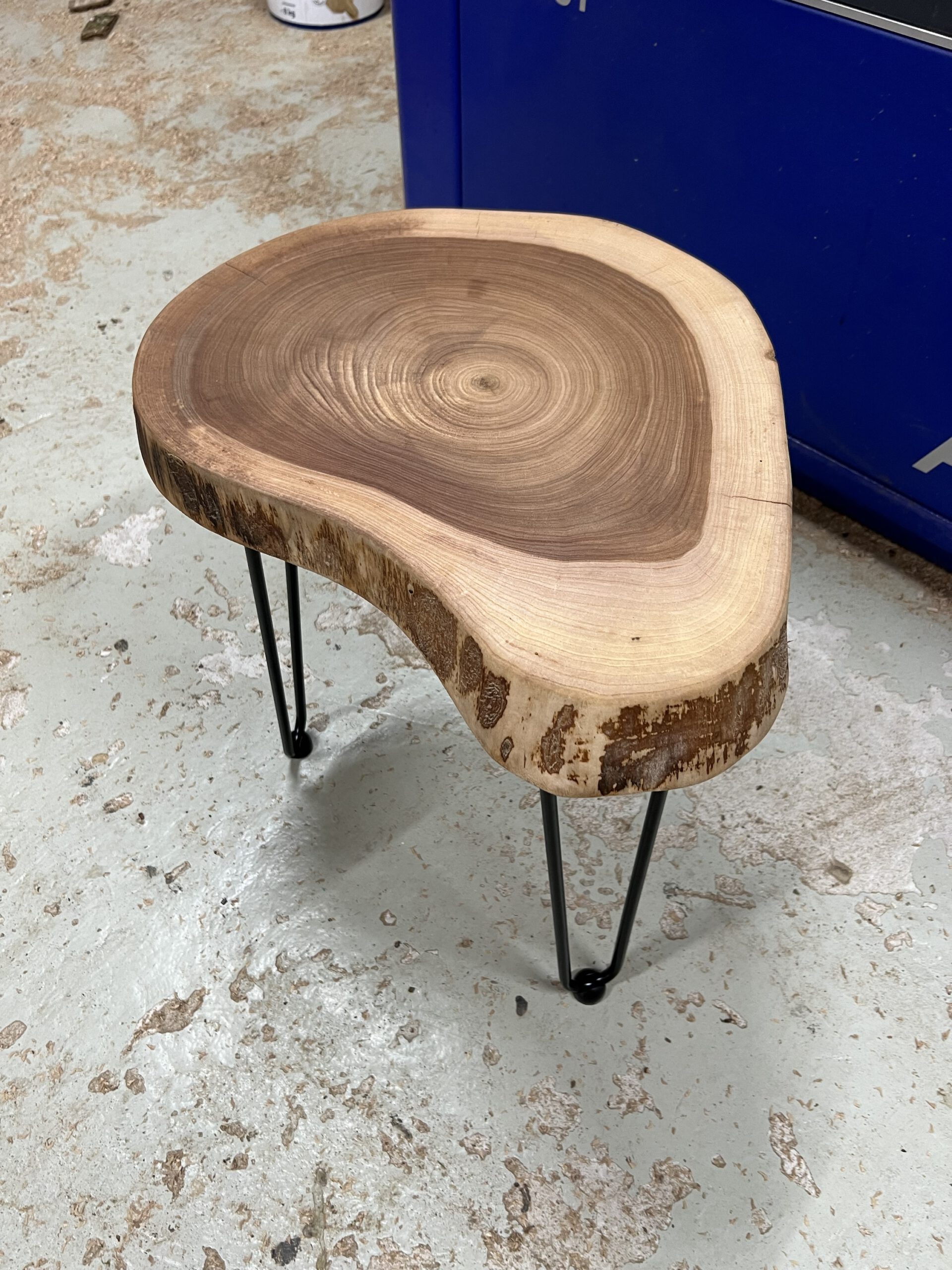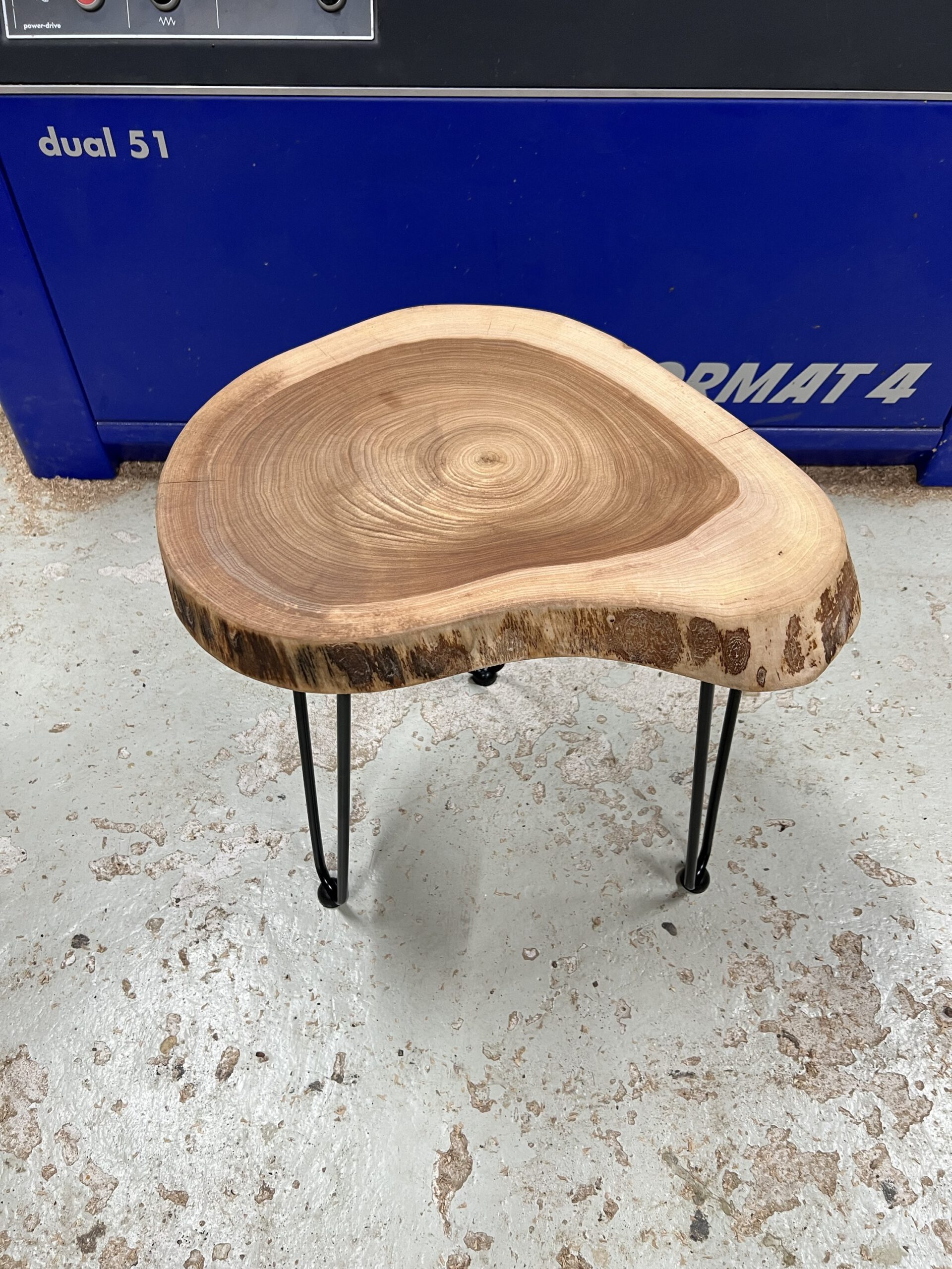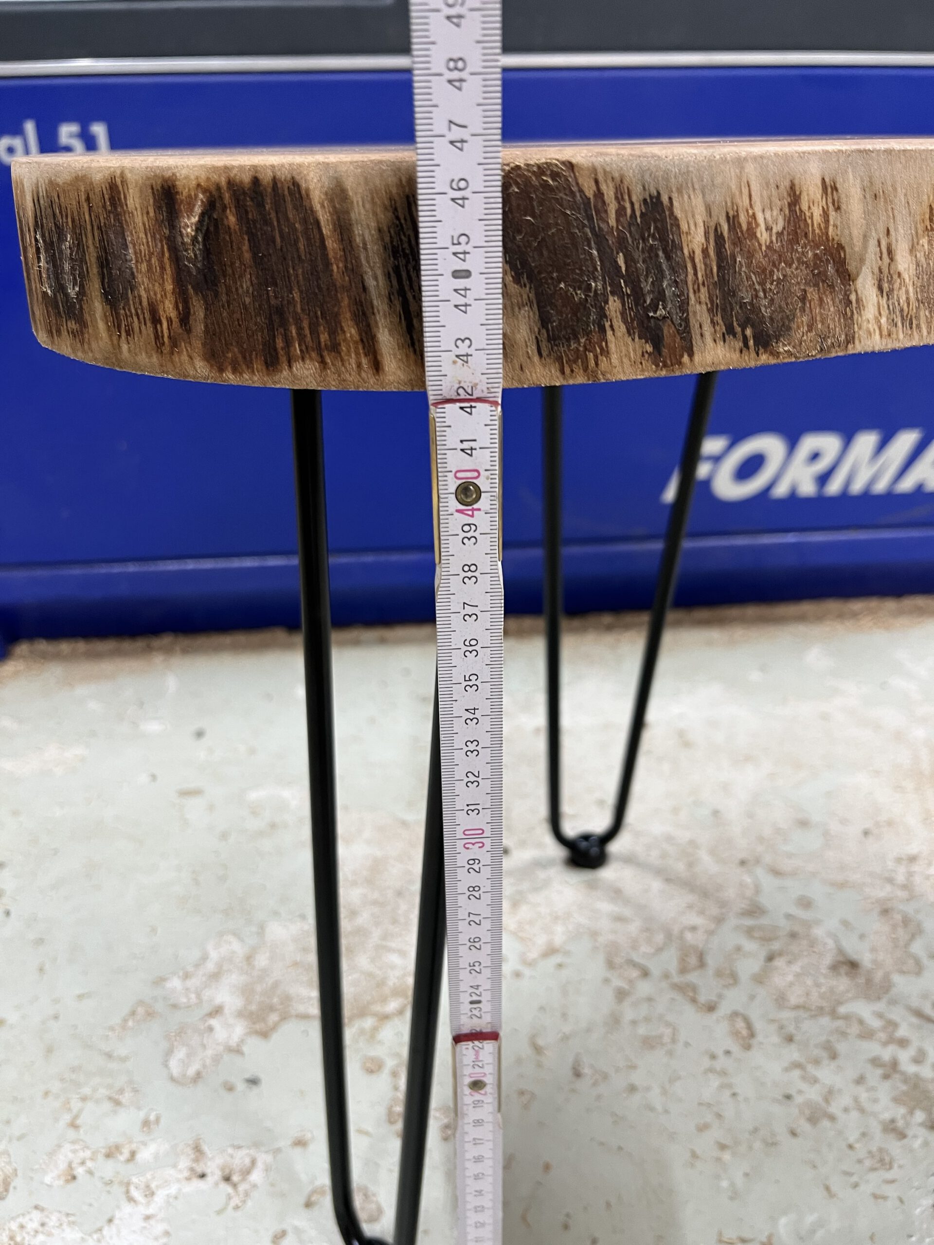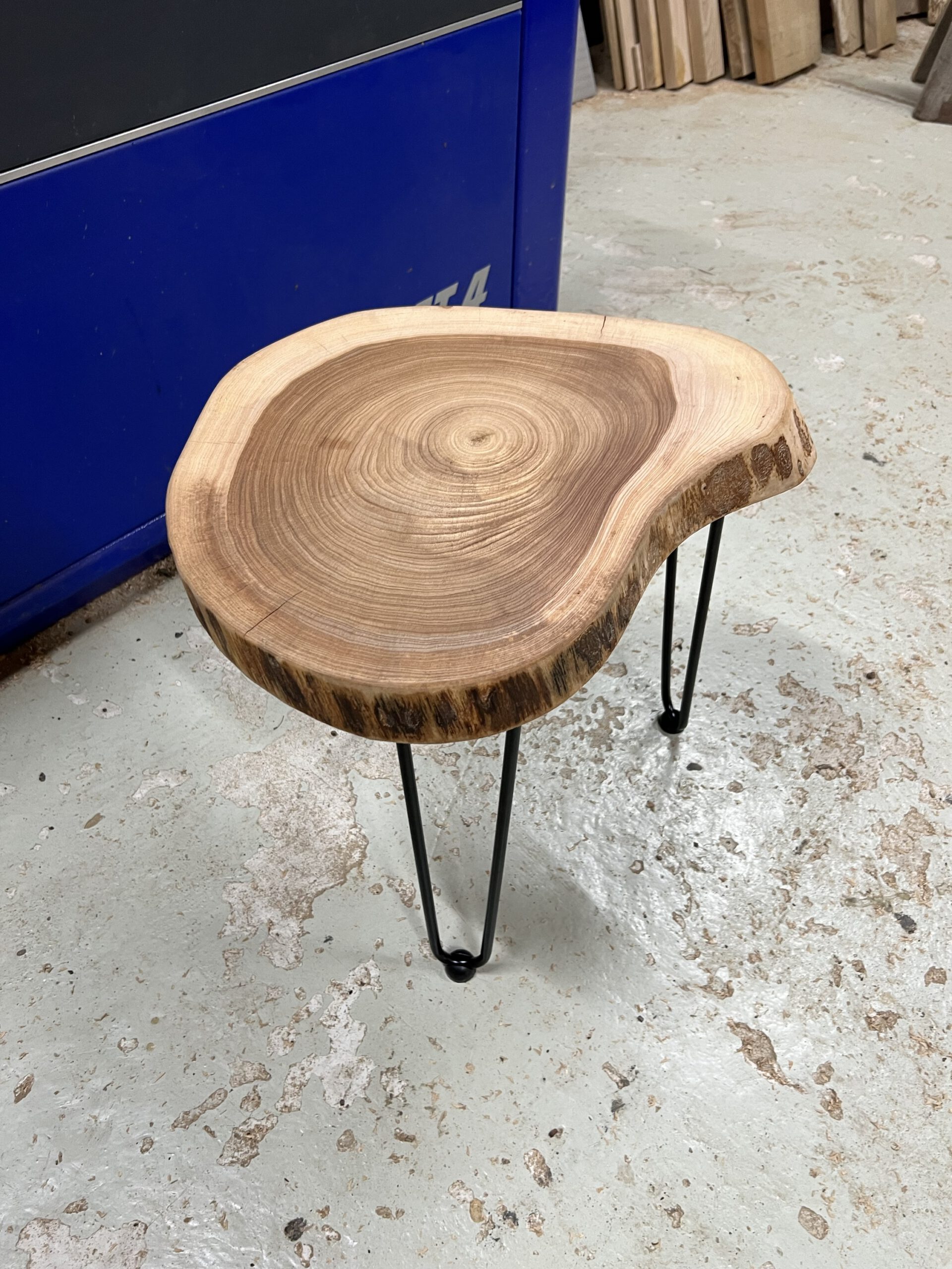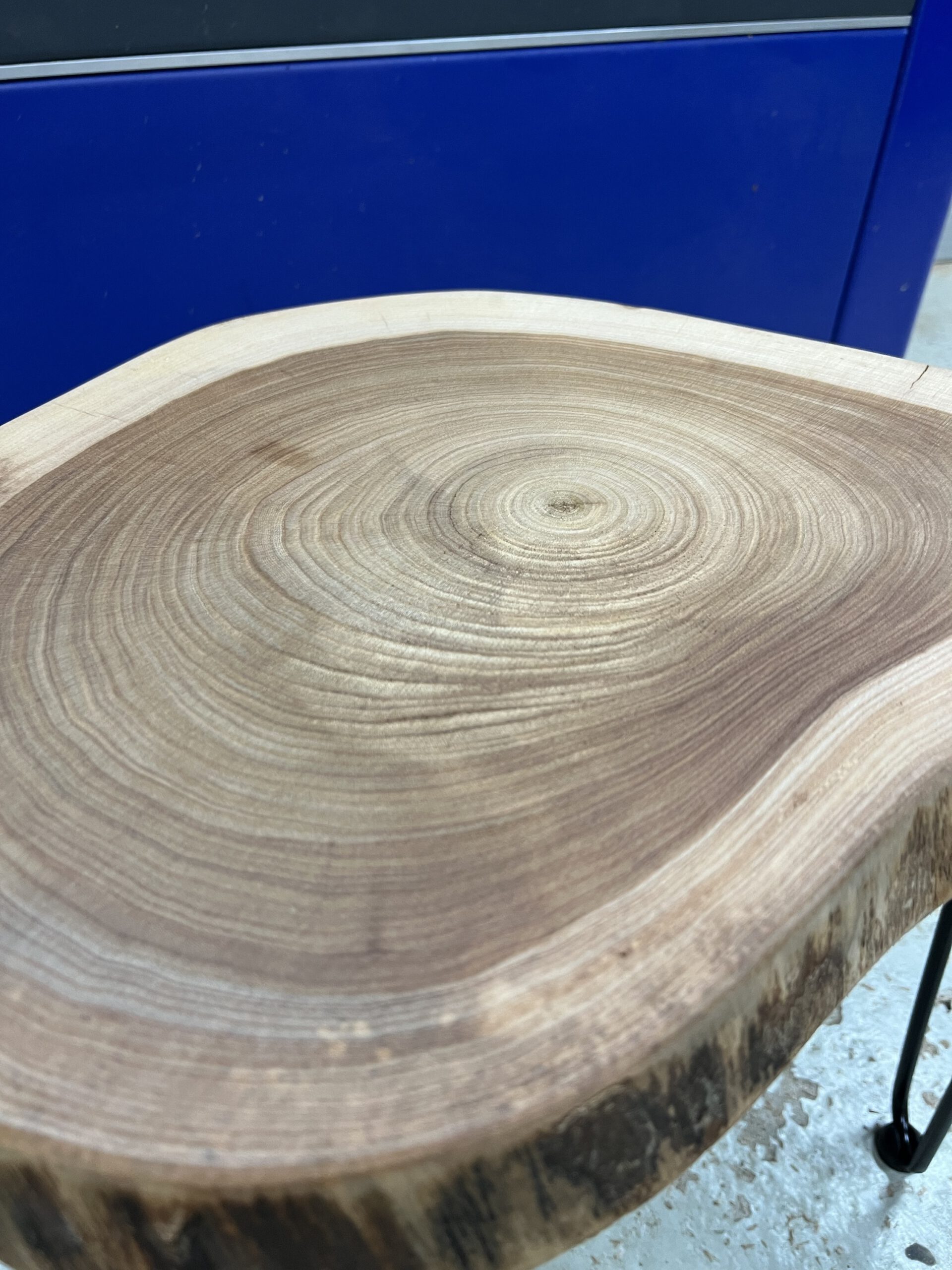 Besonderer Tisch aus einer Ulmen-Baumscheibe mit individueller Maserung – absolutes Unikat.
