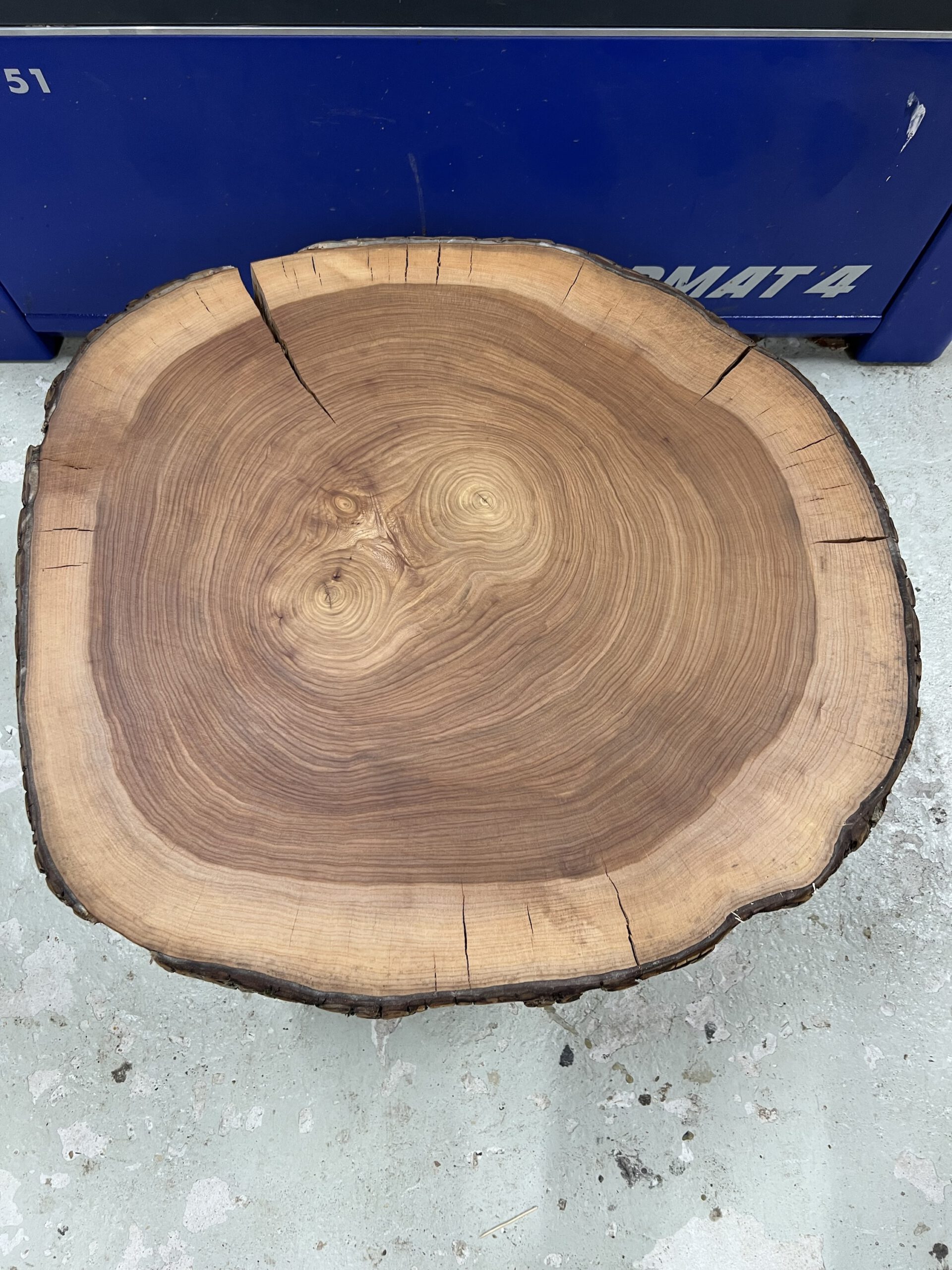 Besonderer Tisch aus einer Ulmen-Baumscheibe mit individueller Maserung – absolutes Unikat.