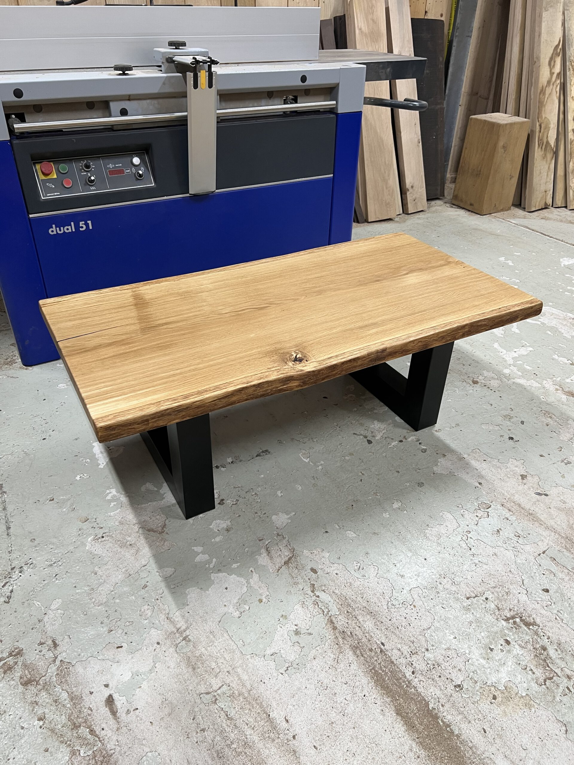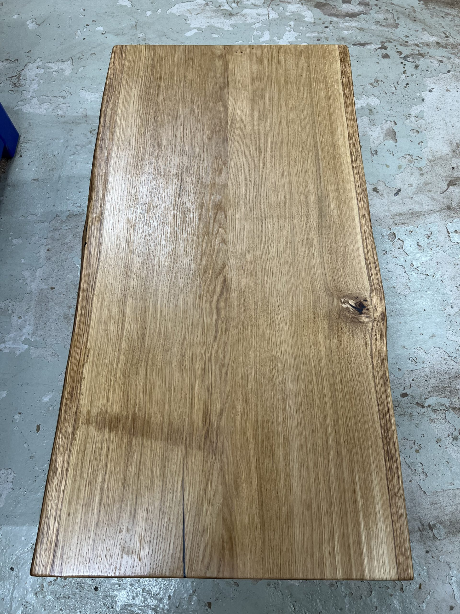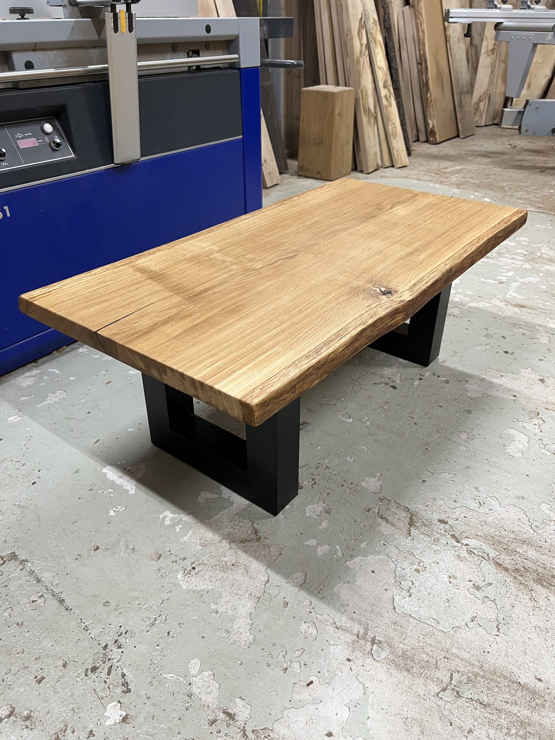 Exklusiver Couchtisch aus massivem Eichenholz mit individueller Maserung und natürlicher Baumkante auf beiden Seiten – jedes Stück ein echtes Unikat.