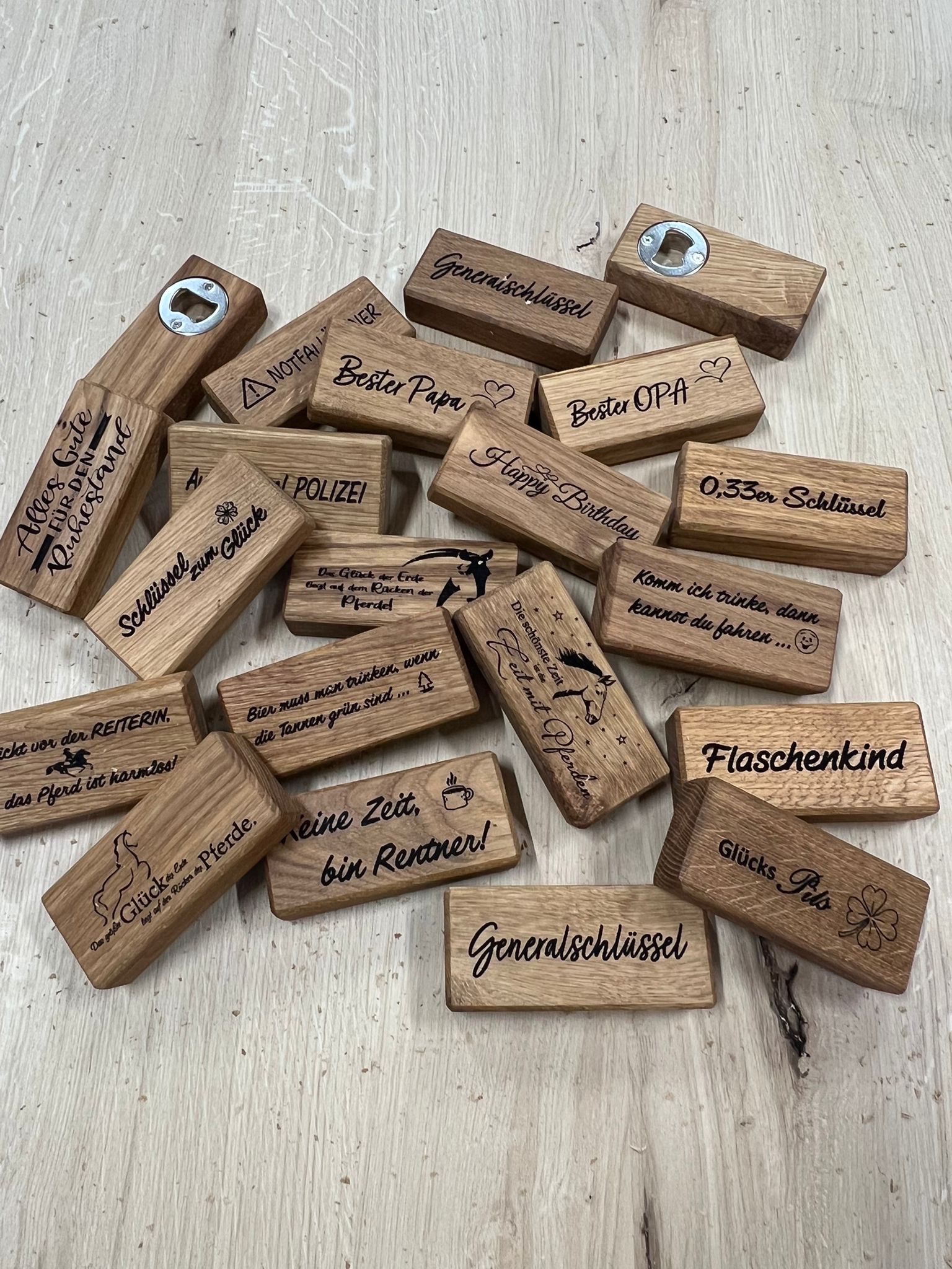 Hochwertiger Flaschenöffner aus Eichenholz – personalisierbar mit deinem individuellen Spruch.